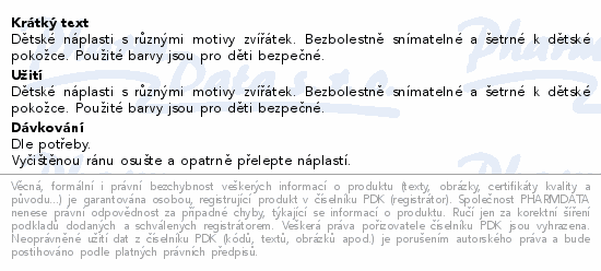 Dětské náplasti s různými motivy zvířátek. Bezbolestně snímatelné a šetrné k dětské pokožce. Použité barvy jsou pro děti bezpečné.