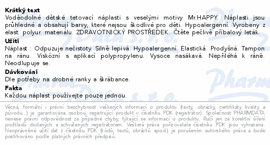 Voděodolné dětské tetovací náplasti s veselými motivy Mr.HAPPY. Náplasti jsou průhledné a obsahují barvy, které nejsou škodlivé pro děti. Hypoalergenní. Vyrobeny z elast. polyur. materiálu. ZDRAVOTNICKÝ PROSTŘEDEK. Čtěte pečlivě příbalový leták.
