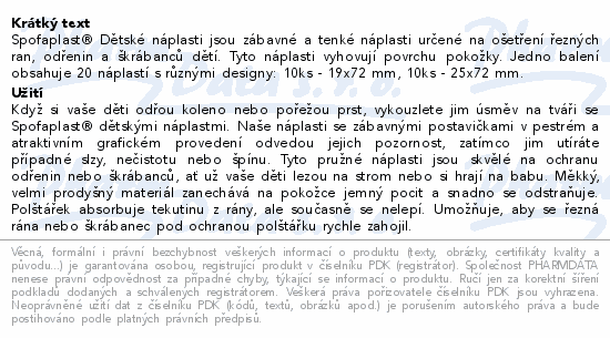 Spofaplast® Dětské náplasti jsou zábavné a tenké náplasti určené na ošetření řezných ran, odřenin a škrábanců dětí. Tyto náplasti vyhovují povrchu pokožky. Jedno balení obsahuje 20 náplastí s různými designy: 10ks - 19x72 mm, 10ks - 25x72 mm.