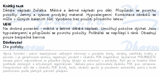 Dětské náplasti Zvířátka. Měkké a šetrné náplasti pro děti. Přizpůsobí se povrchu pokožky. Jemný a vysoce prodyšný materiál. Hypoalergenní. Kombinace obrázků se může v různých baleních lišit. Vyrobeno bez použití přírodního latexu.