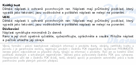 Dětské náplasti k ochraně povrchových ran. Náplasti mají průhledný podklad, který vypadá jako tetování, jsou voděodolné a polštářek náplasti se nelepí na poranění.
