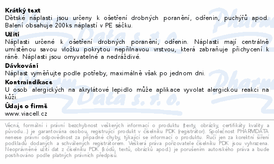 Dětské nápasti jsou určeny k ošetření drobných poranění, odřenin, puchýřů apod. Balení obsahuje 200ks náplastí v PE sáčku.