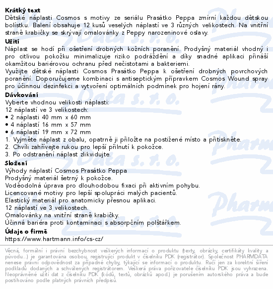 Dětské náplasti Cosmos s motivy ze seriálu Prasátko Peppa zmírní každou dětskou bolístku. Balení obsahuje 12 kusů veselých náplastí ve 3 různých velikostech. Na vnitřní straně krabičky se skrývají omalovánky z Peppy narozeninové oslavy.