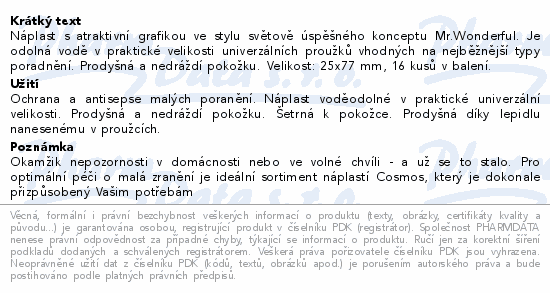 Náplast s atraktivní grafikou ve stylu světově úspěšného konceptu Mr.Wonderful. Je odolná vodě v praktické velikosti univerzálních proužků vhodných na nejběžnější typy poradnění. Prodyšná a nedráždí pokožku. Velikost: 25x77 mm, 16 kusů v balení.