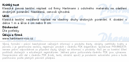 Klasická pevná textilní náplast od firmy Hartmann z odolného materiálu na ošetření drobných poranění. Nedělená, cenově výhodná.