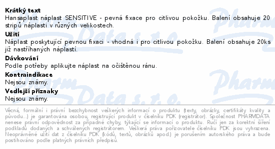 Hansaplast náplast SENSITIVE - pevná fixace pro citlivou pokožku. Balení obsahuje 20 stripů náplasti v různých velikostech.