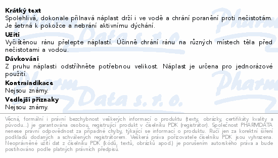 Spolehlivá, dokonale přilnavá náplast drží i ve vodě a chrání poranění proti nečistotám. Je šetrná k pokožce a nebrání aktivnímu dýchání.