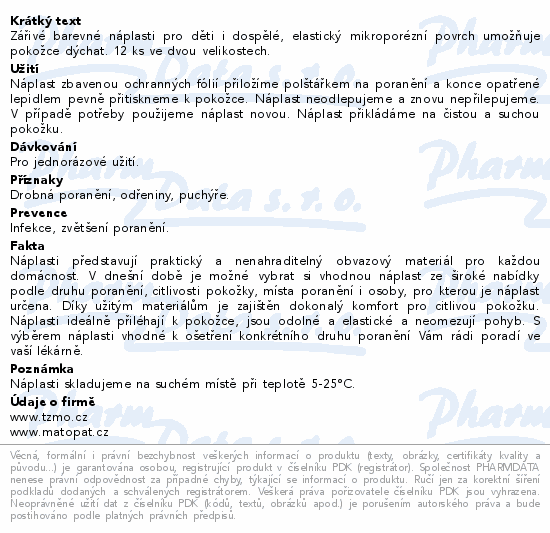 Zářivé barevné náplasti pro děti i dospělé, elastický mikroporézní povrch umožňuje pokožce dýchat. 12 ks ve dvou velikostech.