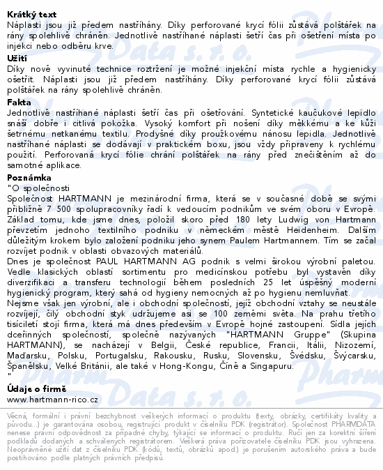 Náplasti jsou již předem nastříhány. Díky perforované krycí fólii zůstává polštářek na rány spolehlivě chráněn. Jednotlivě nastříhané náplasti šetří čas při ošetření místa po injekci nebo odběru krve.