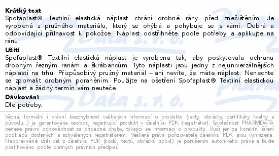 Spofaplast® Textilní elastická náplast chrání drobné rány před znečištěním. Je vyrobená z pružného materiálu, který se ohýbá a pohybuje se s vámi. Dobrá a odpovídající přilnavost k pokožce. Náplast odstřihněte podle potřeby a aplikujte na ránu.