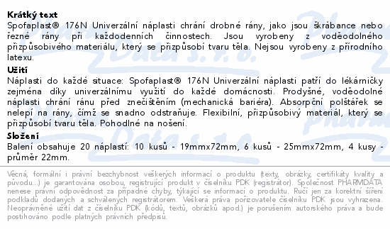 Spofaplast® 176N Univerzální náplasti chrání drobné rány, jako jsou škrábance nebo řezné rány při každodenních činnostech. Jsou vyrobeny z voděodolného přizpůsobivého materiálu, který se přizpůsobí tvaru těla. Nejsou vyrobeny z přírodního latexu.