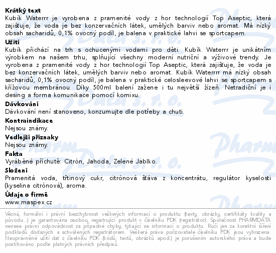 Kubík Waterrr je vyrobena z pramenité vody z hor technologií Top Aseptic, která zajišťuje, že voda je bez konzervačních látek, umělých barviv nebo aromat. Má nízký obsah sacharidů, 0,1% ovocný podíl, je balena v praktické lahvi se sportcapem.