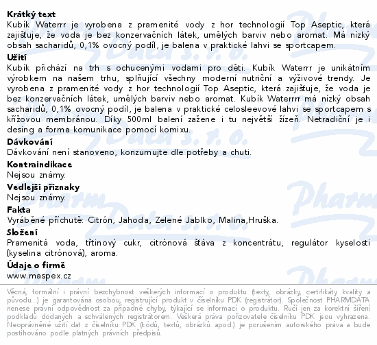 Kubík Waterrr je vyrobena z pramenité vody z hor technologií Top Aseptic, která zajišťuje, že voda je bez konzervačních látek, umělých barviv nebo aromat. Má nízký obsah sacharidů, 0,1% ovocný podíl, je balena v praktické lahvi se sportcapem.