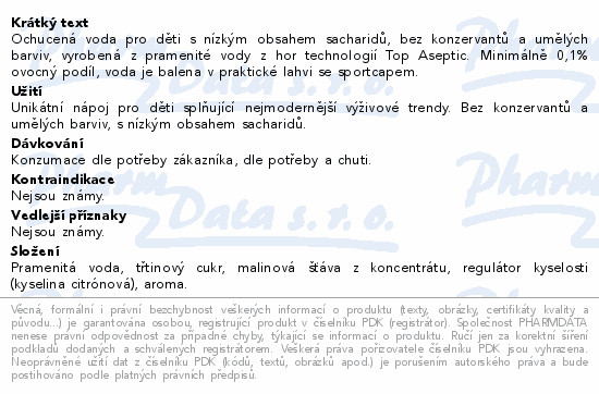 Ochucená voda pro děti s nízkým obsahem sacharidů, bez konzervantů a umělých barviv, vyrobená z pramenité vody z hor technologií Top Aseptic. Minimálně 0,1% ovocný podíl, voda je balena v praktické lahvi se sportcapem.
