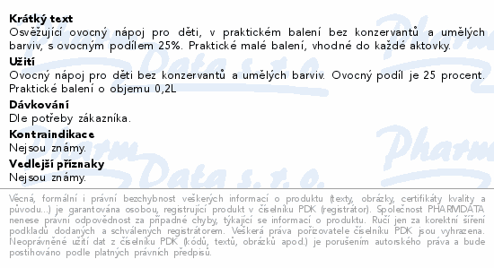 Osvěžující ovocný nápoj pro děti, v praktickém balení bez konzervantů a umělých barviv, s ovocným podílem 25%. Praktické malé balení, vhodné do každé aktovky.