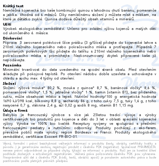 Nemléčná kojenecká bio kaše kombinující quinou s lahodnou chutí banánu, pomeranče a jablka. Vhodná od 6 měsíců. Díky nemléčnému složení ji můžete mísit s mlékem, na které je děťátko zvyklé. Quinoa dodává důležitý obsah vitaminů a minerálů.