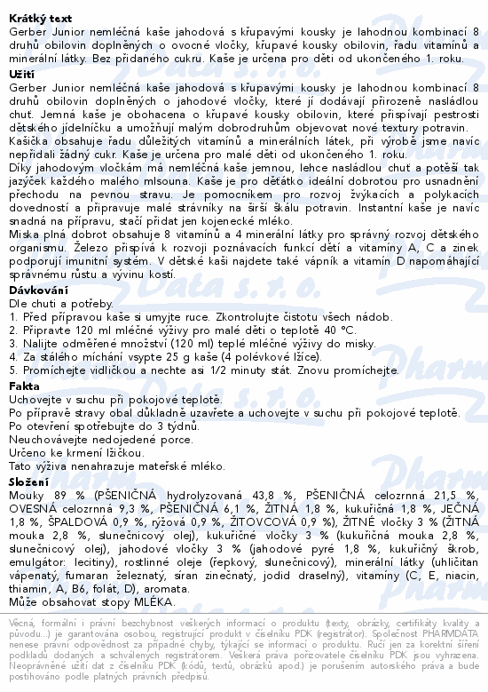 Gerber Junior nemléčná kaše jahodová s křupavými kousky je lahodnou kombinací 8 druhů obilovin doplněných o ovocné vločky, křupavé kousky obilovin, řadu vitamínů a minerální látky. Bez přidaného cukru. Kaše je určena pro děti od ukončeného 1. roku.