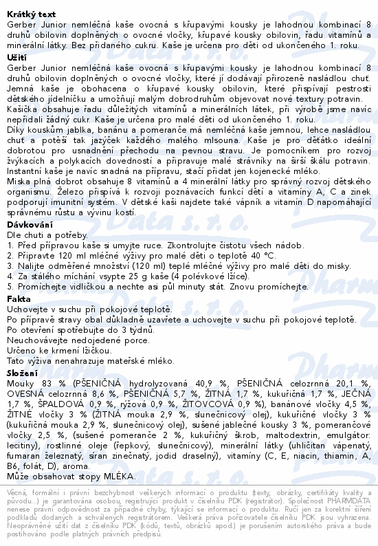 Gerber Junior nemléčná kaše ovocná s křupavými kousky je lahodnou kombinací 8 druhů obilovin doplněných o ovocné vločky, křupavé kousky obilovin, řadu vitamínů a minerální látky. Bez přidaného cukru. Kaše je určena pro děti od ukončeného 1. roku.