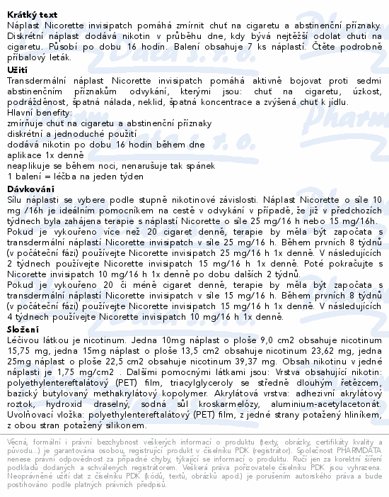 Náplast Nicorette invisipatch pomáhá zmírnit chuť na cigaretu a abstinenční příznaky. Diskrétní náplast dodává nikotin v průběhu dne, kdy bývá nejtěžší odolat chuti na cigaretu. Působí po dobu 16 hodin. Balení obsahuje 7 ks náplastí. Čtěte pozorně příbalový leták.