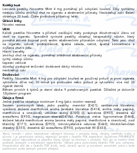 Lisované pastilky Nicorette Mint 4 mg pomáhají při odvykání kouření. Díky rychlému nástupu účinku zmírňují chuť na cigaretu a abstinenční příznaky. Neobsahují cukr. Balení obsahuje 20 kusů. Čtěte pozorně příbalový leták.