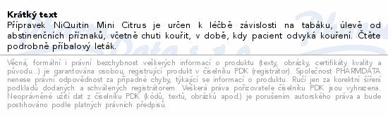 Přípravek NiQuitin Mini Citrus je určen k léčbě závislosti na tabáku, úlevě od abstinenčních příznaků, včetně chuti kouřit, v době, kdy pacient odvyká kouření. Čtěte pozorně příbalový leták.