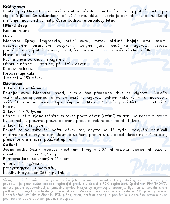 Orální sprej Nicorette pomáhá zbavit se závislosti na kouření. Sprej potlačí touhu po cigaretě již po 30 sekundách, při užití dvou dávek. Navíc je bez obsahu cukru. Sprej má příjemnou příchuť máty. Čtěte pozorně příbalový leták.