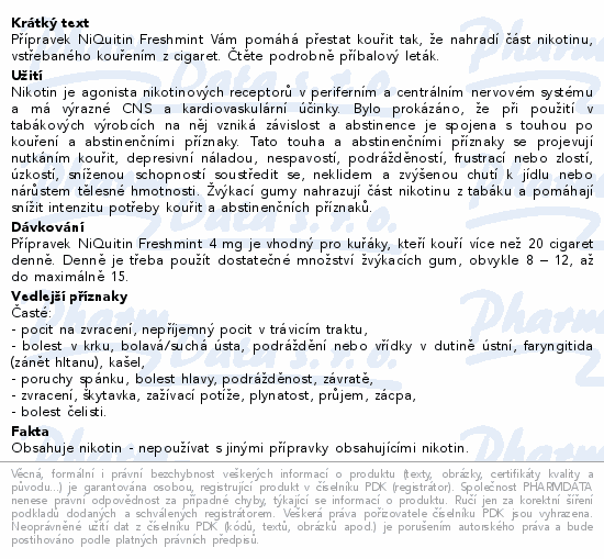 Přípravek NiQuitin Freshmint Vám pomáhá přestat kouřit tak, že nahradí část nikotinu, vstřebaného kouřením z cigaret. Čtěte pozorně příbalový leták.