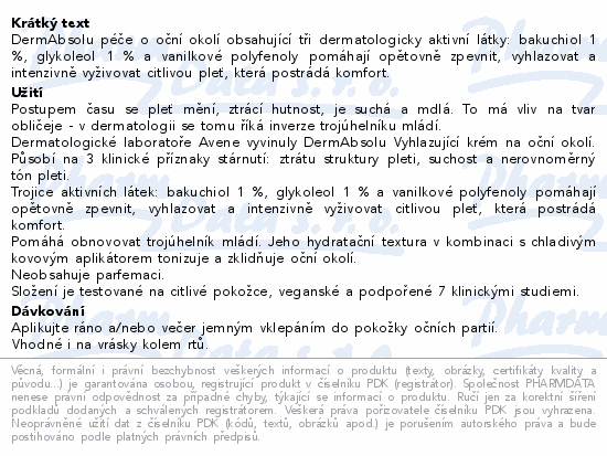 DermAbsolu péče o oční okolí obsahující tři dermatologicky aktivní látky: bakuchiol 1 %, glykoleol 1 % a vanilkové polyfenoly pomáhají opětovně zpevnit, vyhlazovat a intenzivně vyživovat citlivou pleť, která postrádá komfort.