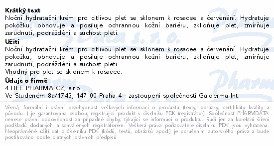 Noční hydratační krém pro citlivou pleť se sklonem k rosacee a červenání. Hydratuje pokožku, obnovuje a posiluje ochrannou kožní bariéru, zklidňuje pleť, zmírňuje zarudnutí, podráždění a suchost pleti.