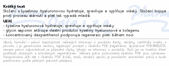 Složení s kyselinou hyaluronovou hydratuje, zpevňuje a vyplňuje vrásky. Složení bojuje proti procesu stárnutí a pleť tak vypadá mladší.