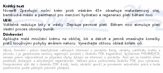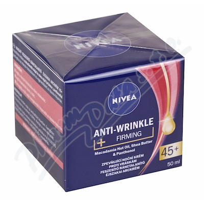 Nivea® Zpevňující noční krém proti vráskám 45+ obsahuje makadamiový olej, bambucké máslo a panthenol pro inenzivní hydrataci a regeneraci pleti během noci.