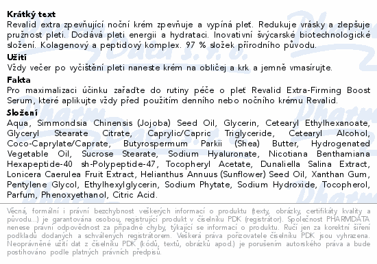 Revalid extra zpevňující noční krém zpevňuje a vypíná pleť. Redukuje vrásky a zlepšuje pružnost pleti. Dodává pleti energii a hydrataci. Inovativní švýcarské biotechnologické složení. Kolagenový a peptidový komplex. 97 % složek přírodního původu.