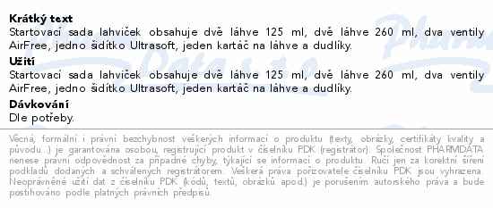 Startovací sada lahviček obsahuje dvě láhve 125 ml, dvě láhve 260 ml, dva ventily AirFree, jedno šidítko Ultrasoft, jeden kartáč na láhve a dudlíky.