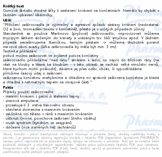 Gumové škrtidlo vhodné šířky k zastavení krvácení na končetinách. Nemělo by chybět v žádném vybavení lékárničky.