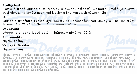 Elastické tkané obinadlo se svorkou s dlouhou tažností. Obinadlo umožňuje fixovat krycí obvazy na končetinách nad klouby a i na kónických částech těla.
