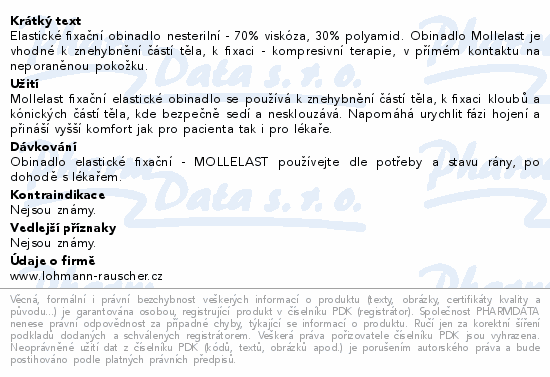 Elastické fixační obinadlo nesterilní - 70% viskóza, 30% polyamid. Obinadlo Mollelast je vhodné k znehybnění částí těla, k fixaci - kompresivní terapie, v přímém kontaktu na neporaněnou pokožku.