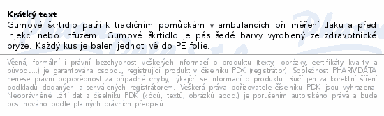 Gumové škrtidlo patří k tradičním pomůckám v ambulancích při měření tlaku a před injekcí nebo infuzemi. Gumové škrtidlo je pás šedé barvy vyrobený ze zdravotnické pryže. Každý kus je balen jednotlivě do PE folie.