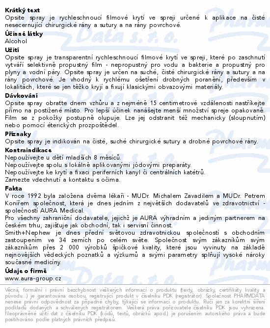 Opsite spray je rychleschnoucí filmové krytí ve spreji určené k aplikace na čisté nesecernující chirurgické rány a sutury a na rány povrchové.