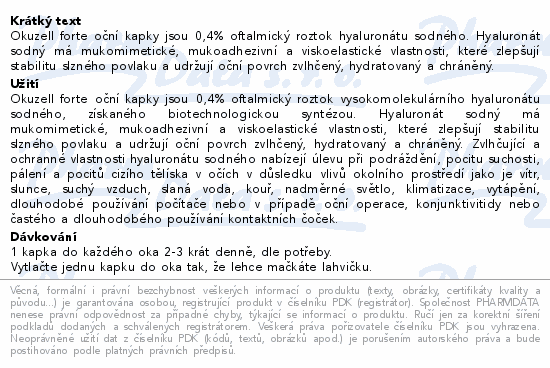 Okuzell forte oční kapky jsou 0,4% oftalmický roztok hyaluronátu sodného. Hyaluronát sodný má mukomimetické, mukoadhezivní a viskoelastické vlastnosti, které zlepšují stabilitu slzného povlaku a udržují oční povrch zvlhčený, hydratovaný a chráněný.