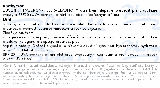 EUCERIN HYALURON-FILLER+ELASTICITY oční krém zlepšuje pružnost pleti, vyplňuje vrásky a SPF20+UVA ochrana chrání plať před předčasným stárnutím.