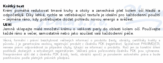 Krém pomáhá redukovat tmavé kruhy a otoky a zanechává pleť kolem očí hladší a odpočatější. Díky lehké, rychle se vstřebávající textuře je ideální pro každodenní použití – zejména ráno, kdy potřebujete dodat pohledu novou energii a svěžest.