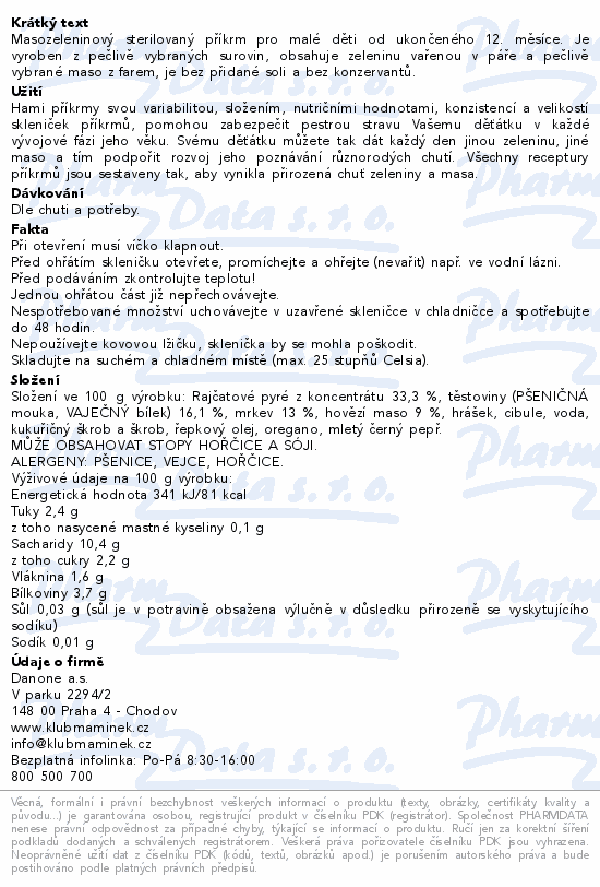 Masozeleninový sterilovaný příkrm pro malé děti od ukončeného 12. měsíce. Je vyroben z pečlivě vybraných surovin, obsahuje zeleninu vařenou v páře a pečlivě vybrané maso z farem, je bez přidané soli a bez konzervantů.