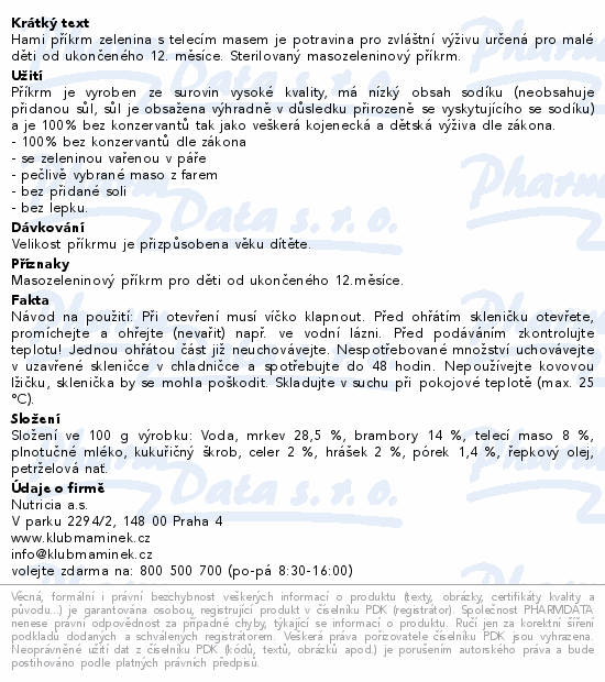 Hami příkrm zelenina s telecím masem je potravina pro zvláštní výživu určená pro malé děti od ukončeného 12. měsíce. Sterilovaný masozeleninový příkrm.