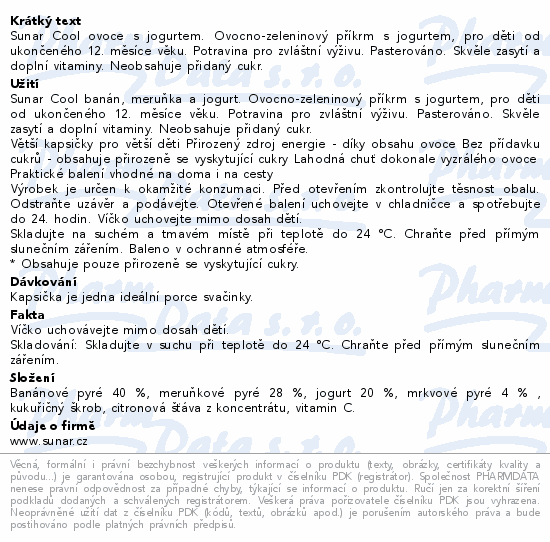 Sunar Cool ovoce s jogurtem. Ovocno-zeleninový příkrm s jogurtem, pro děti od ukončeného 12. měsíce věku. Potravina pro zvláštní výživu. Pasterováno. Skvěle zasytí a doplní vitaminy. Neobsahuje přidaný cukr.