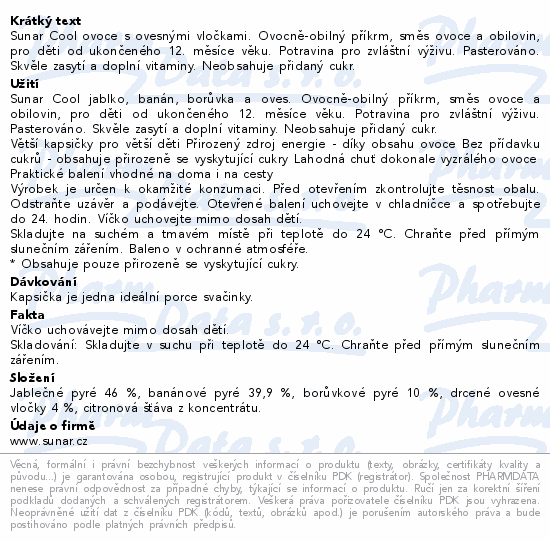 Sunar Cool ovoce s ovesnými vločkami. Ovocně-obilný příkrm, směs ovoce a obilovin, pro děti od ukončeného 12. měsíce věku. Potravina pro zvláštní výživu. Pasterováno. Skvěle zasytí a doplní vitaminy. Neobsahuje přidaný cukr.