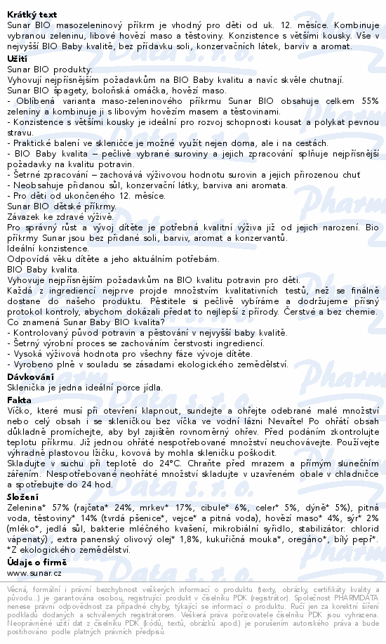 Sunar BIO masozeleninový příkrm je vhodný pro děti od uk. 12. měsíce. Kombinuje vybranou zeleninu, libové hovězí maso a těstoviny. Konzistence s většími kousky. Vše v nejvyšší BIO Baby kvalitě, bez přídavku soli, konzervačních látek, barviv a aromat.