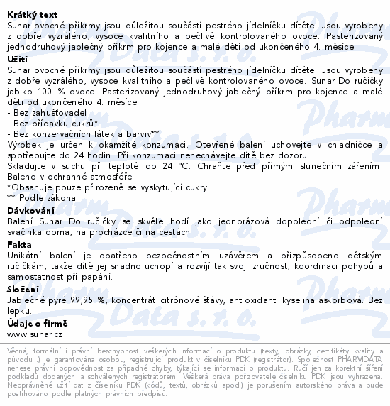 Sunar ovocné příkrmy jsou důležitou součástí pestrého jídelníčku dítěte. Jsou vyrobeny z dobře vyzrálého, vysoce kvalitního a pečlivě kontrolovaného ovoce. Pasterizovaný jednodruhový jablečný příkrm pro kojence a malé děti od ukončeného 4. měsíce.