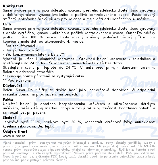 Sunar ovocné příkrmy jsou důležitou součástí pestrého jídelníčku dítěte. Jsou vyrobeny z dobře vyzrálého, vysoce kvalitního a pečlivě kontrolovaného ovoce. Pasterizovaný smíšený jablečnohruškový příkrm pro kojence a malé děti od ukončeného 4. měsíce.