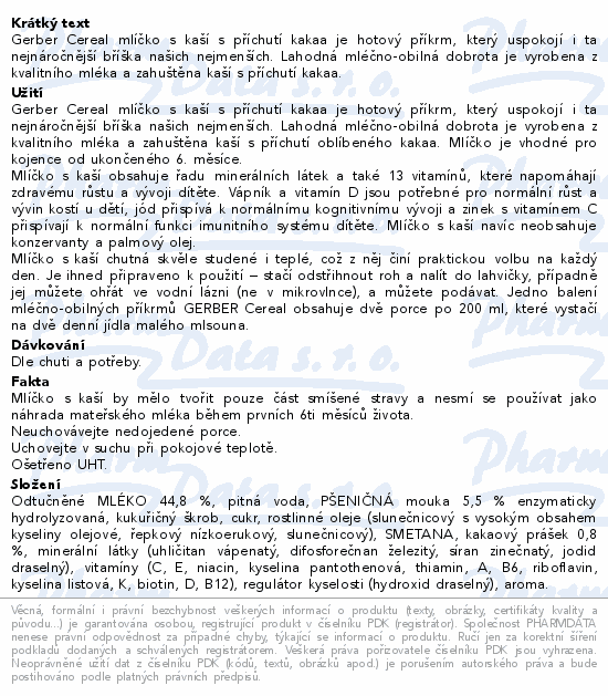 Gerber Cereal mlíčko s kaší s příchutí kakaa je hotový příkrm, který uspokojí i ta nejnáročnější bříška našich nejmenších. Lahodná mléčno-obilná dobrota je vyrobena z kvalitního mléka a zahuštěna kaší s příchutí kakaa.