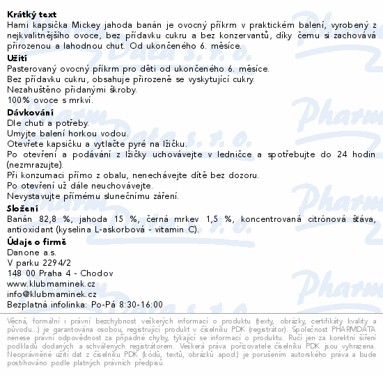 Hami kapsička Mickey jahoda banán je ovocný příkrm v praktickém balení, vyrobený z nejkvalitnějšího ovoce, bez přídavku cukru a bez konzervantů, díky čemu si zachovává přirozenou a lahodnou chuť. Od ukončeného 6. měsíce.